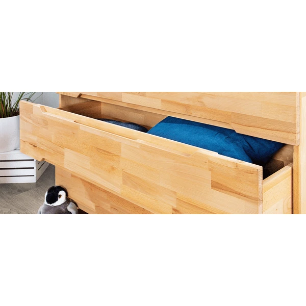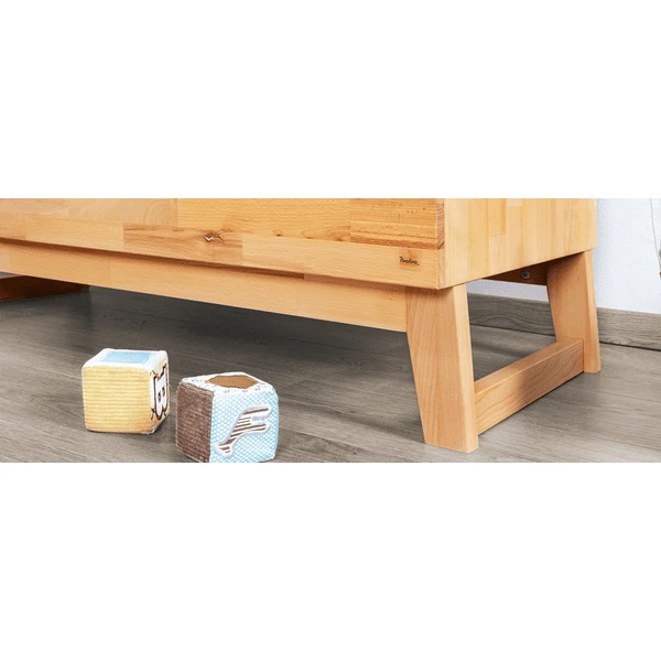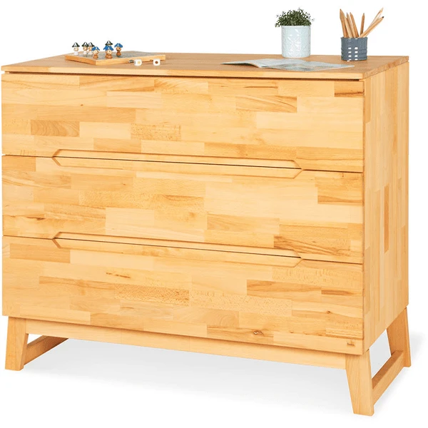 La estructura de madera claramente visible y las empuñaduras fresadas empotradas llaman la atenciĂłn en cualquier guarderĂa. El cambiador puede montarse a la izquierda, a la derecha o en el centro, o puede retirarse por completo para crear un moderno lateral board . La amplia construcciĂłn y los tres grandes cajones aden proporcionan suficiente espacio para pañales, productos de cuidado y otros accesorios. DespuĂ©s de la hora del cambio de pañales, tambiĂ©n se pueden guardar allĂ camisetas, pantalones o jerseys. Los cajones están equipados con el probado sistema Self-Soft-Close, que les permite cerrarse de forma segura y silenciosa. Los dedos de los niños pequeños tambiĂ©n están protegidos de las desagradables magulladuras cuando ayudan a sacar los utensilios para cambiar los pañales.