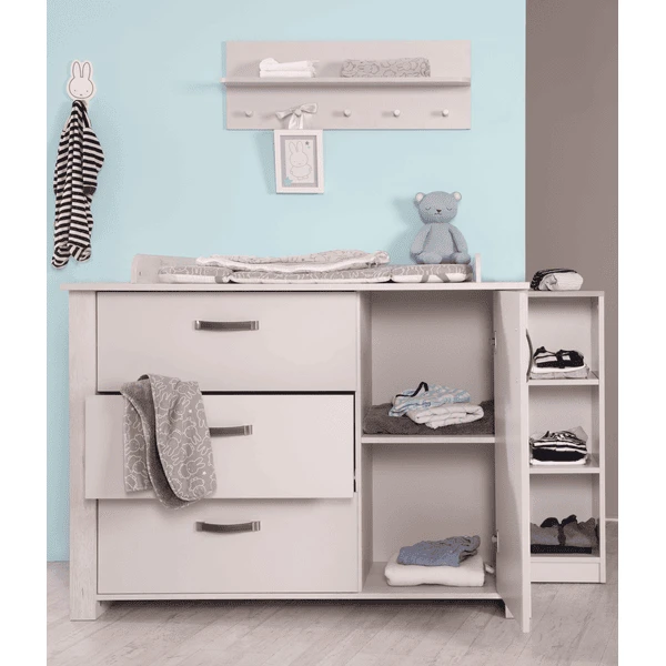 El cambiador roba con tapa cambiadora es un verdadero todoterreno y le servirá durante muchos años. El robusto cambiador puede utilizarse como asiento elevado para su hijo de guardería, para que pueda ayudarle fácilmente a vestirse en una cómoda posición de pie. Más adelante, el cambiador puede utilizarse como cómoda en el salón o en la habitación del niño. El cambiador con asas de aspecto de cuero y sin tornillos visibles en modern es una de nuestras versiones más amplias. Con otros muebles infantiles de la serie “Mila”, puede crear una elegante habitación infantil o de bebé. El cambiador se ha desarrollado en Alemania y cumple las normas de seguridad vigentes según la norma EN 12221 – 1+2:2008 + A1:2013. El cambiador “Mila” es fácil de montar.