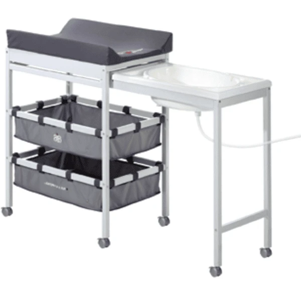 Esta práctica combinación de lavado y cambio está hecha de madera sólida y resistente. Con un simple movimiento de muñeca, puede transformarse de una mesa de cambio a una lavandería. El cambiador cubierto de tela está recubierto con poliuretano inofensivo y por lo tanto es agradable a la piel, lavable y fácil de limpiar. La bañera se puede sacar de debajo del cambiador si es necesario, y volver a desaparecer bajo el cambiador después de la B aden . La manguera de desagüe de la bañera facilita el drenaje del agua del baño sin mover la bañera. Además, esta combinación de lavado y cambio tiene dos compartimentos de almacenamiento de tela para guardar todos los utensilios necesarios. La base de madera es enrollable para permitir una fácil reubicación.