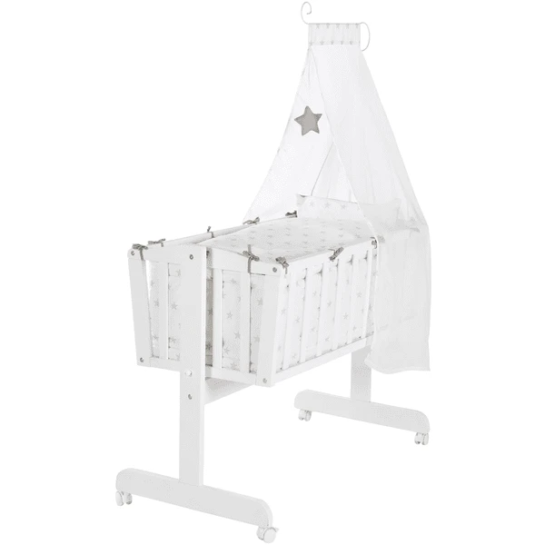 Con los conjuntos de cuna completos de roba , los pequeños pueden ser maravillosamente mecidos para dormir. La ropa de cama de la cuna, suave y diseñada con cariño, así como la cuna acolchada, hacen que el sueño sea especialmente cómodo. En caso de que el movimiento sea excesivo, las cunas de roba se pueden fijar rápida y fácilmente con un botón de bloqueo.